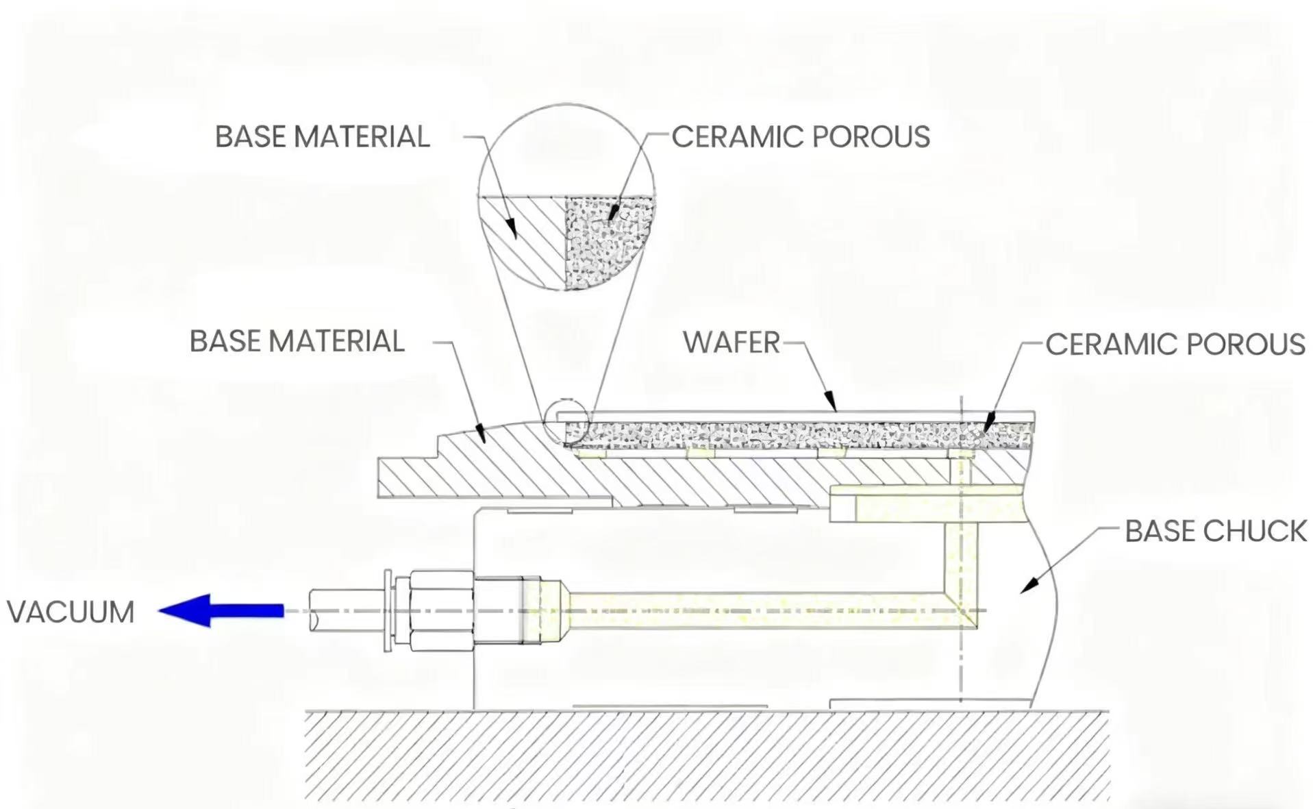 Персонализиранопатронник от пореста керамикаСъстои се от основата и порестата керамична плоча. Свързвайки се към вакуумна система, средата с ниско налягане се създава чрез евакуиране на въздуха между пластината и керамиката. При вакуумно отрицателно налягане пластината е здраво залепена към повърхността на патронника, като в крайна сметка се постига безопасно и стабилно фиксиране и позициониране.