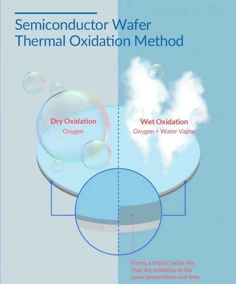 При процеса на сухо окисляване, вафлите се подлагат на високотемпературна среда, обогатена с чист O₂ за окисление. Сухото окисление протича бавно, тъй като кислородните молекули са по-тежки от водните молекули. Въпреки това, това е предимство за производството на тънки, висококачествени оксидни слоеве, тъй като тази по-бавна скорост позволява по-прецизен контрол върху дебелината на филма. Този процес може да произведе хомогенен SiO₂ филм с висока плътност, без да произвежда нежелани странични продукти като водород. Подходящ е за производството на тънки оксидни слоеве в устройства, които изискват прецизен контрол върху дебелината и качеството на оксида, като оксиди на MOSFET gate.