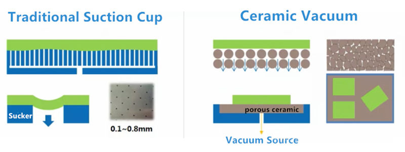 Традиционните метални патронници имат неравномерна засмукваща сила, склонни са към деформация върху тънки материали, нямат антистатични свойства и са склонни към износване и разкъсване поради ниската си твърдост. Керамичните вакуумни патронници, от друга страна, са подходящи за тънки части, предлагат антистатични свойства и са устойчиви на износване и корозия.