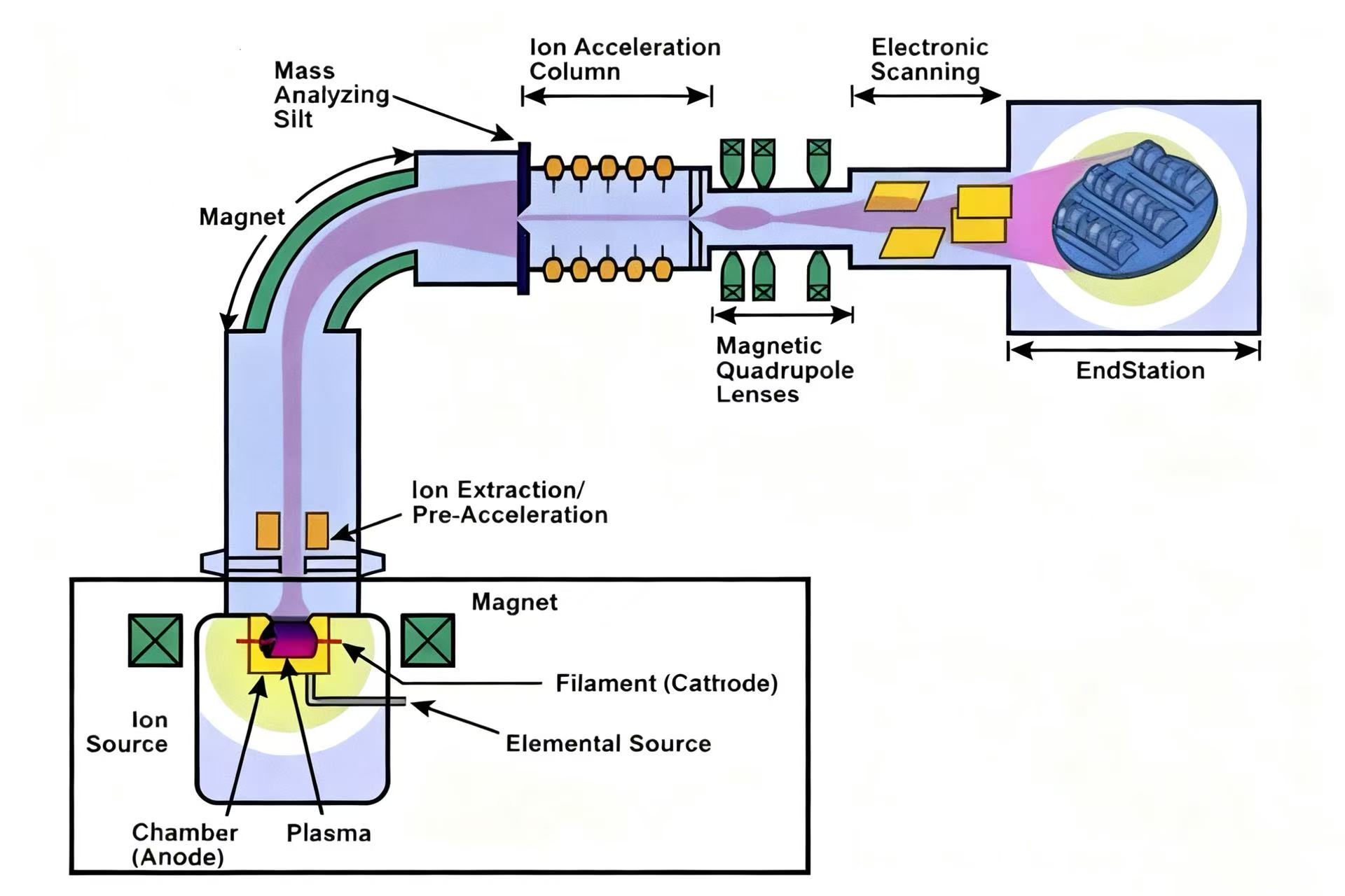 2.Имплантирането на йони е основната техника за легиране в производството на полупроводници, която има няколко предимства, като висока точност на легиране, ниски температури на процеса и малко увреждане на материала на субстрата. По-конкретно, процесът на имплантиране на йони включва йонизиране на примесни атоми за създаване на заредени йони, след което ускоряване на тези йони чрез електрическо поле с висок интензитет за образуване на високоенергиен йонен лъч. След това повърхността на полупроводника се удря от тези бързо движещи се йони, което позволява прецизно имплантиране с регулируема дълбочина на легиране. Тази техника е особено полезна за създаване на плитки съединителни структури, като областите на източника и дренажа на MOSFET, и позволява високопрецизен контрол върху разпределението и концентрацията на примеси.