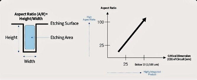 Съотношението на страните, както подсказва името, е съотношението на дълбочината на ецване към ширината на отвора. Структурите на аспектното съотношение са основно изискване за 3D устройства в MEMS и трябва да бъдат оптимизирани чрез газово съотношение и контрол на мощността, за да се избегне влошаване на долната скорост.