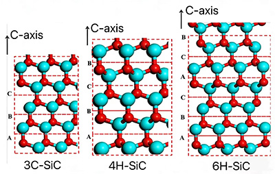 Разбира се, материалът SiC не е съставен от единичен тетраедър от един Si атом и един C атом, а от безброй Si и C атоми. Голям брой Si и C атоми образуват вълнообразни двойни атомни слоеве (един слой C атоми и един слой Si атоми), а множество двойни атомни слоеве се натрупват, за да образуват SiC кристали. Поради периодични промени, възникващи по време на процеса на подреждане на Si-C двойни атомни слоеве, в момента има повече от 200 различни кристални структури с различни подредби. Понастоящем най-често срещаните кристални форми в практически приложения са 3C-SiC, 4H-SiC и 6H-SiC.
