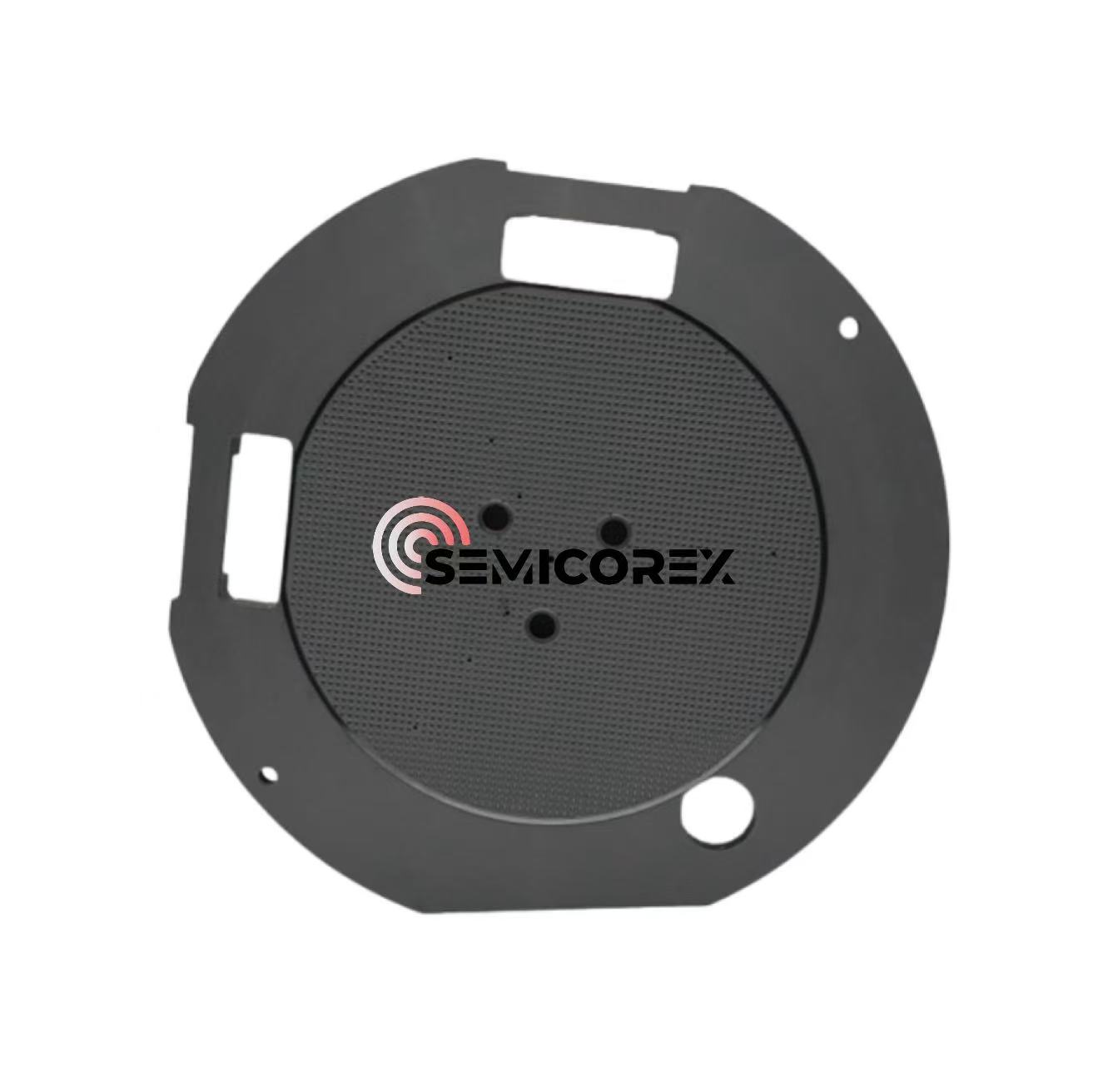 Прецизно проектираните микро-отвори са равномерно разпределени по повърхността на SiC керамичните вакуумни патронници, което позволява надеждна връзка с външното вакуумно оборудване. По време на работа вакуумната помпа се активира, за да изтегли въздух през отворите, създавайки среда с отрицателно налягане между полупроводниковата пластина и вакуумния патронник. Следователно това позволява пластината да бъде равномерно и здраво задържана върху повърхността на вакуумния патронник.
