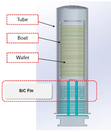 Полукорекс твърдребра от силициев карбидобикновено се инсталират като топлоизолационни компоненти във вертикални пещни тръби на оборудване за термична обработка на полупроводници, като RTP пещи за отгряване и дифузионни пещи. Ребрата от твърд силициев карбид Semicorex могат ефективно да регулират разпределението на температурата във високотемпературни пещи и да сведат до минимум топлинното увреждане на уплътнителните части на вратата на процеса, причинено от високи температури. При работни условия на мокро оксидиране ребра от твърд силициев карбид Semicorex могат да се използват за ефективно предотвратяване на отрицателни въздействия върху резултатите от процеса и полупроводниковите устройства, причинени от кондензация на водна пара при относително ниски температури на процеса.